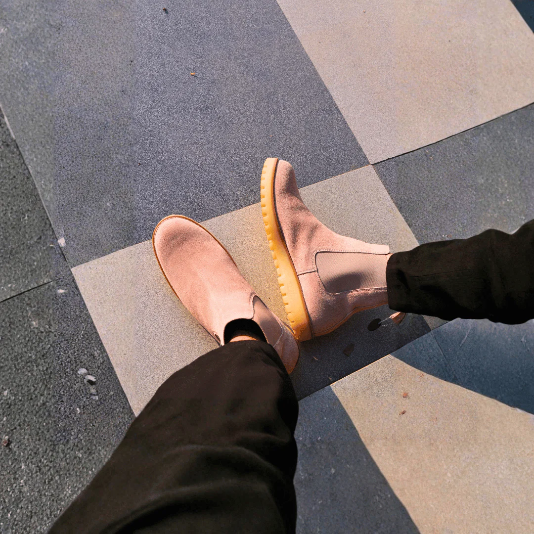 Inspired by winter skies and warm Noon Chai cups shared in the snow. The pastel pink suede upper contrasts rugged terrain, carrying the charm of slow winter days, laughter in the cold, and memories that stay long after the trip ends.