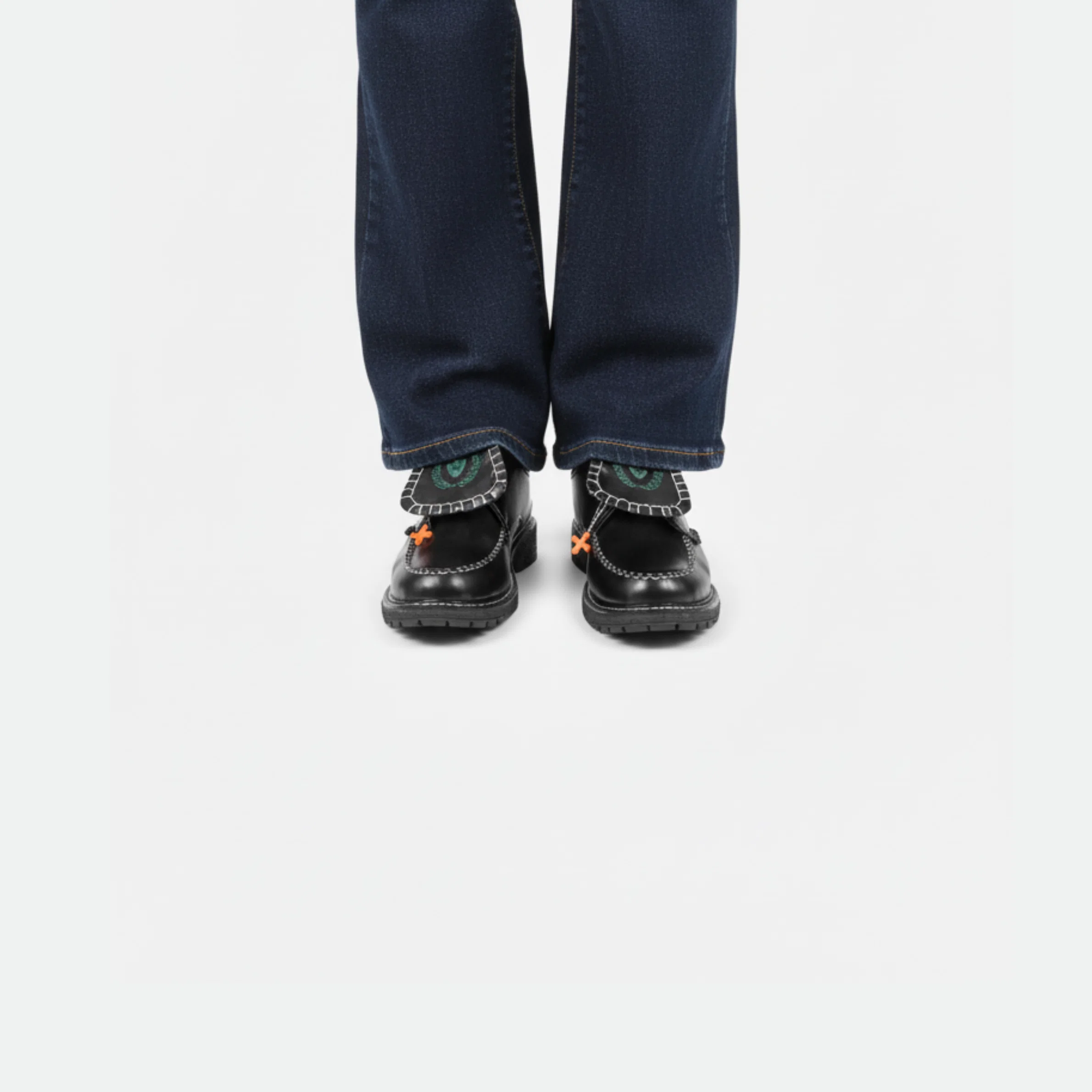 The Offside Derby channels street rage into a structured derby silhouette. Inspired by concrete pitches and chaotic matches, it blends classic form with raw energy. The removable tongue lets you switch the mood — layered and loud, or stripped back and sharp. Contrast stitching nods to hand-done street fixes, while the mascot embossing at the back leaves your signature.